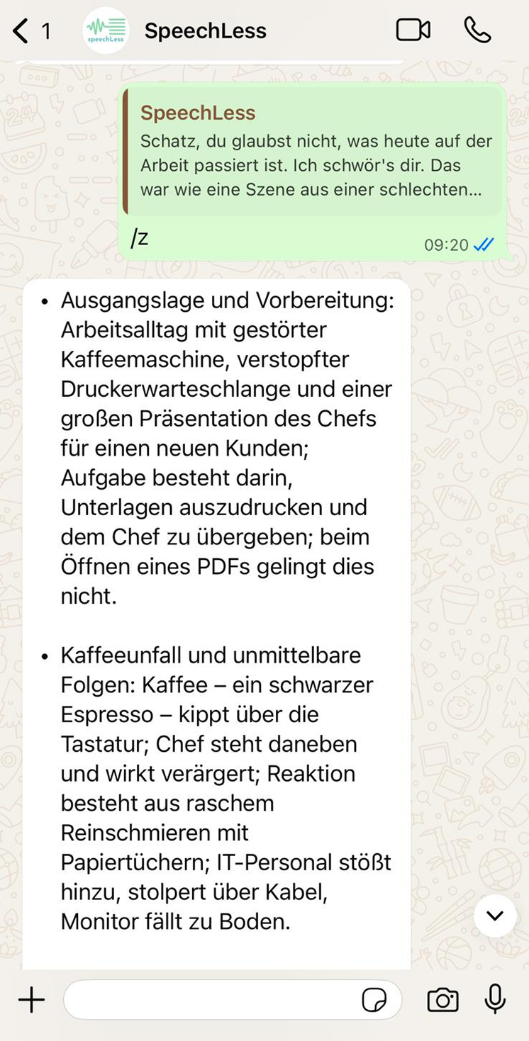 You simply send an audio file or voice message to the SpeechLess bot (phone number: +49 1522 7102054). Shortly after, you receive the transcription directly in the chat.