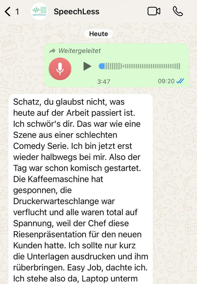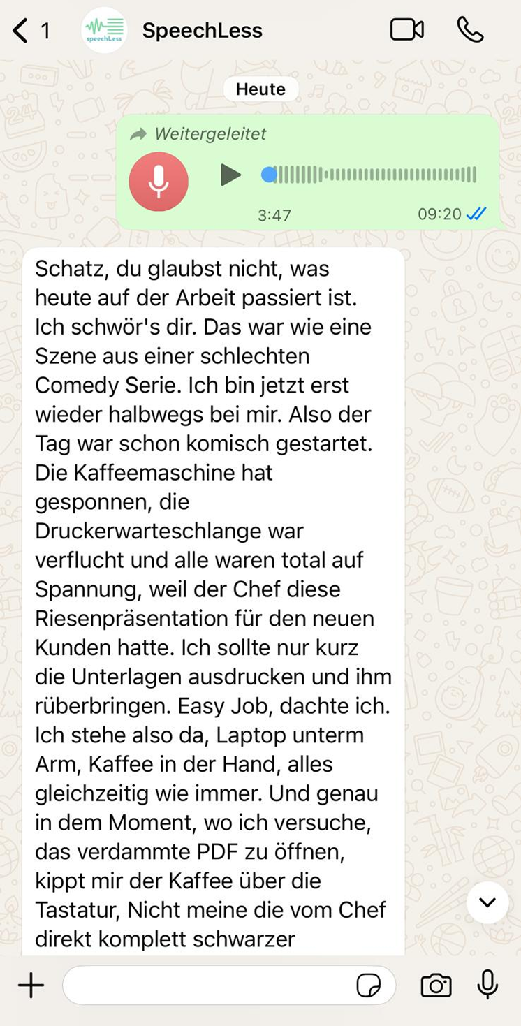 You simply send an audio file or voice message to the SpeechLess bot (phone number: +49 1522 7102054). Shortly after, you receive the transcription directly in the chat.