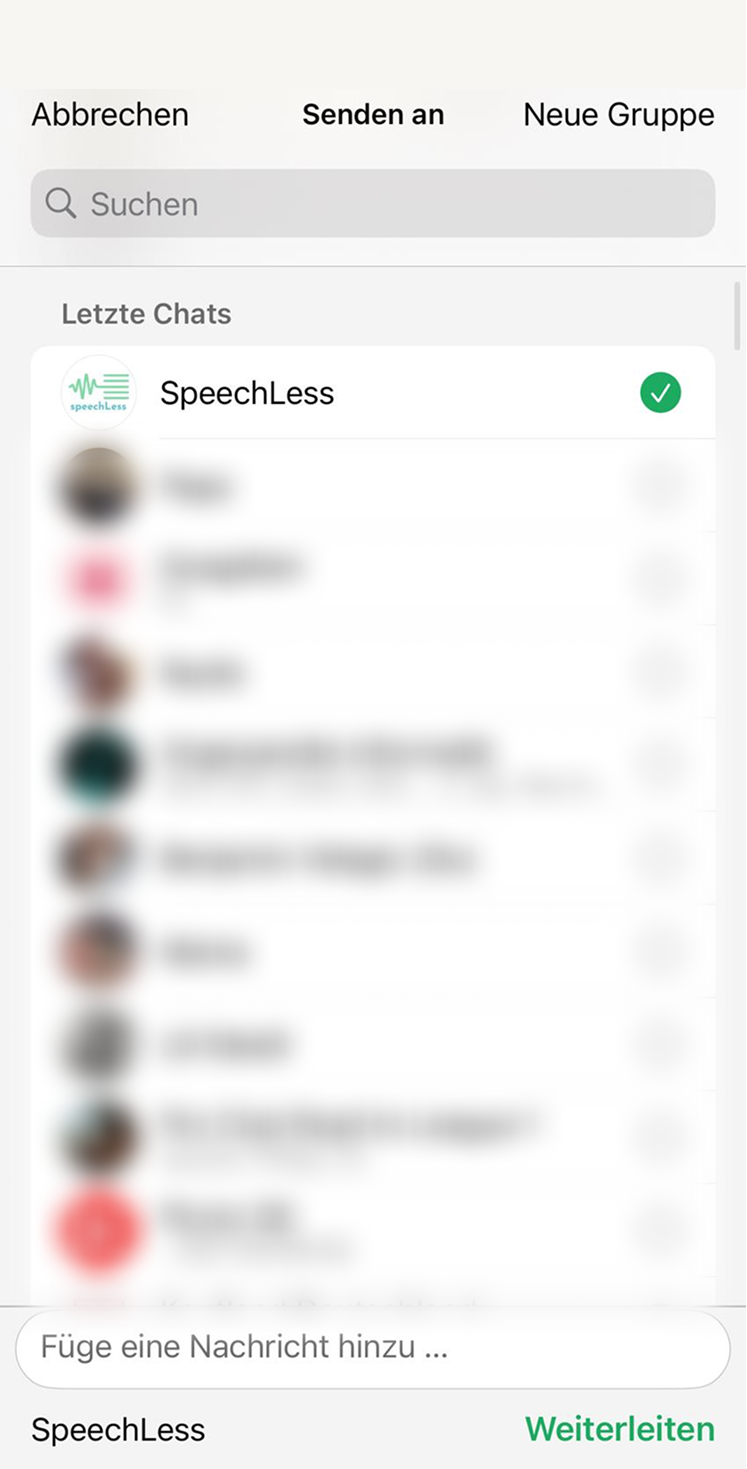 Select a voice message and forward it to SpeechLess (phone number: +49 1522 7102054)